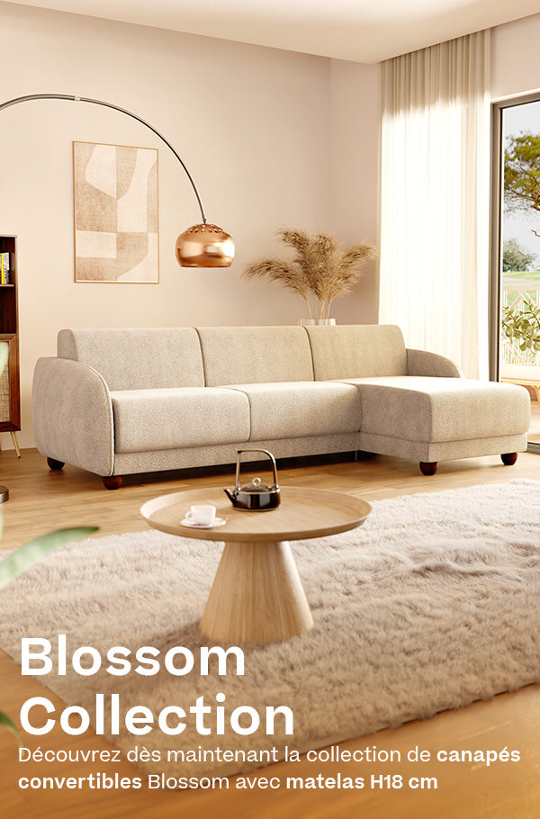Canapé d'angle convertible avec matelas H18 cm et chaise longue coffre en bouclette douce T07 beige