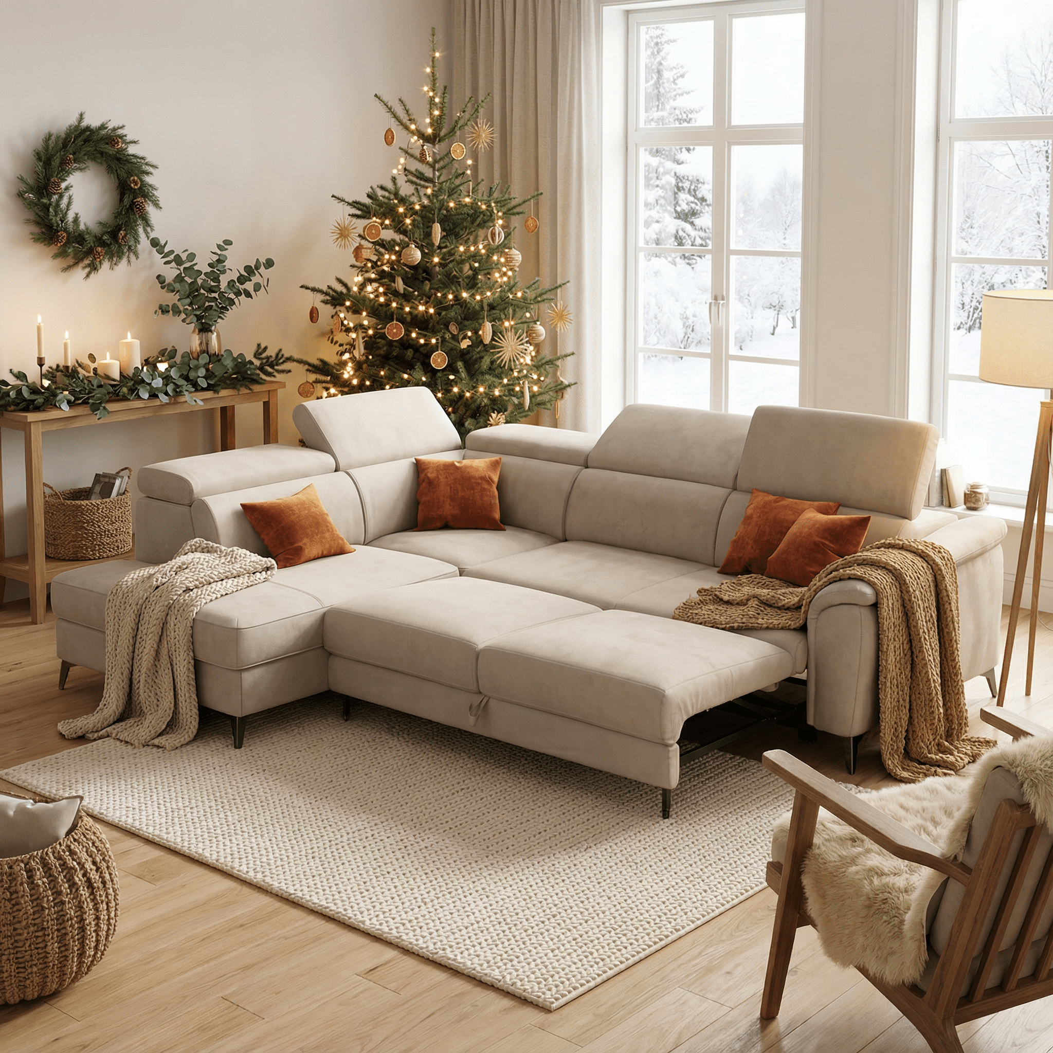 Canapé convertible d'angle avec têtières inclinables en tissu doux imperméable T02 crème
