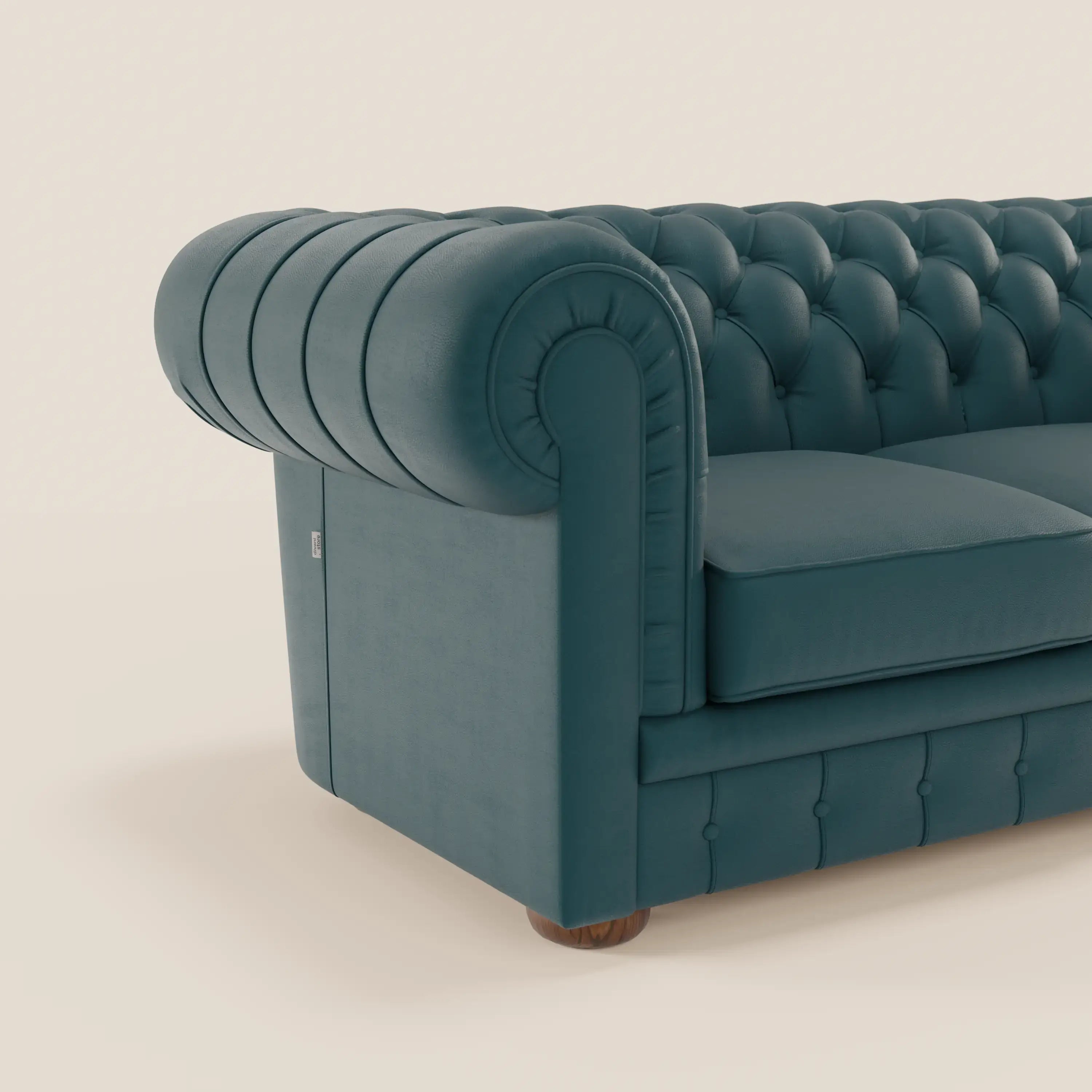 Contrairement à de nombreuses productions qui « simulent » l’effet capitonné sur du polyuréthane imprimé, le Chester naît d’un travail entièrement artisanal : chaque pli, bouton et tension du capitonné fait main témoignent d’un savoir-faire 100 % Made in Italy. Les accoudoirs enroulés, le piquage profond et l’assise généreuse transforment le salon en un véritable espace de caractère : un mélange parfait entre charme « club » et présence luxueuse contemporaine.