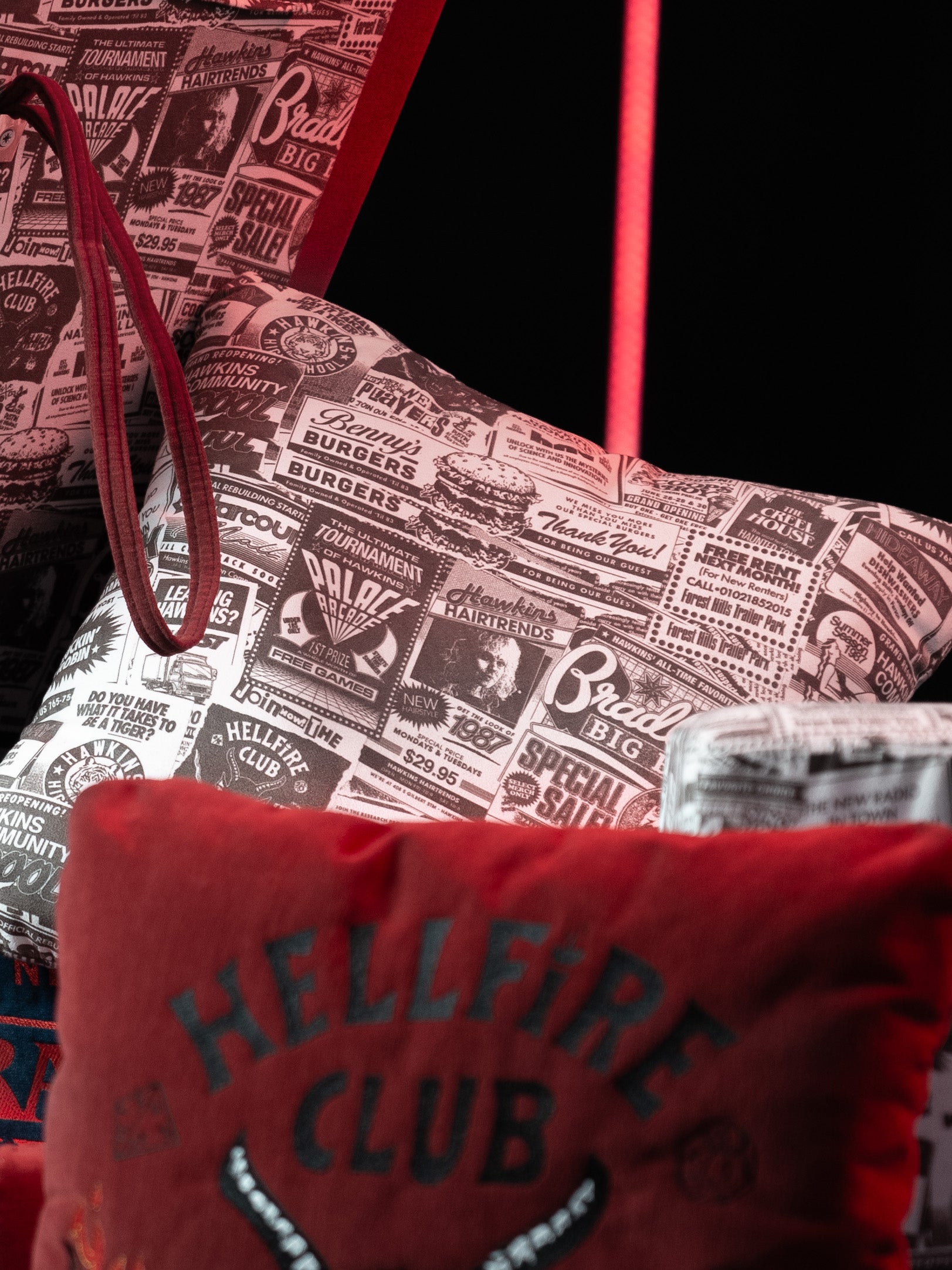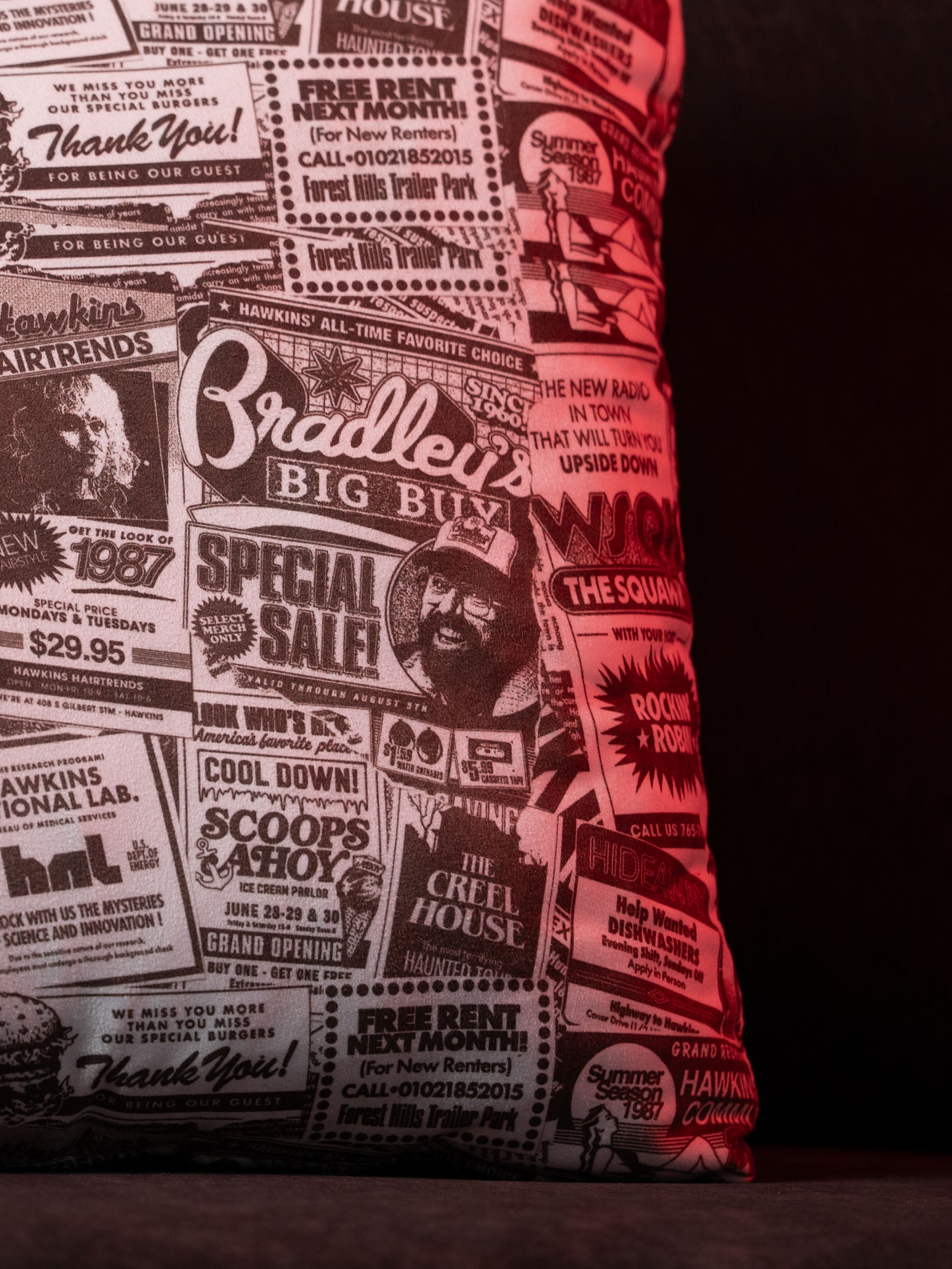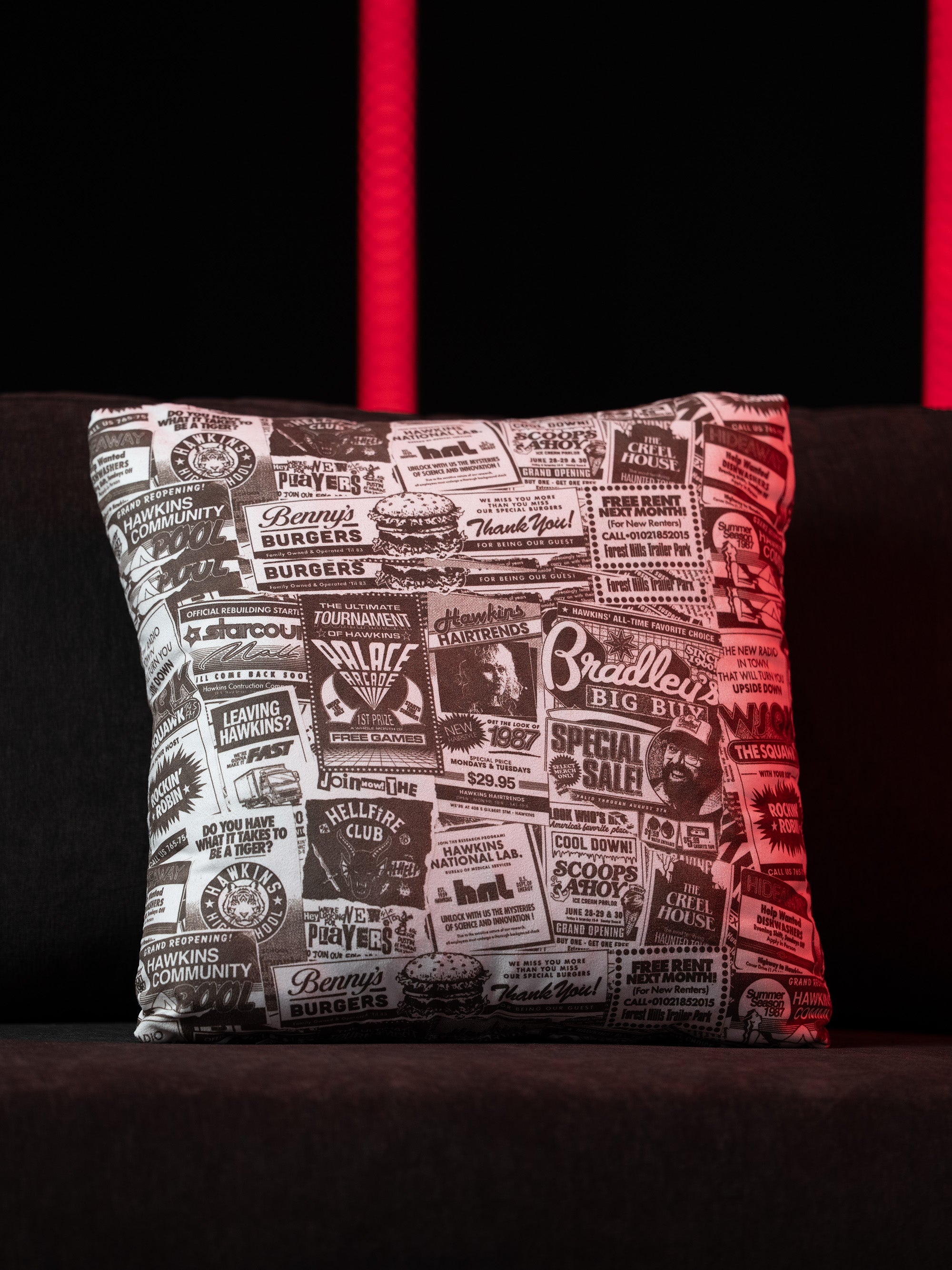 De la collaboration officielle entre Netflix et Divani.store naît le coussin Hawkins Post – Stranger Things Édition Limitée, un accessoire d'ameublement qui célèbre l'aspect le plus graphique et emblématique de la série.