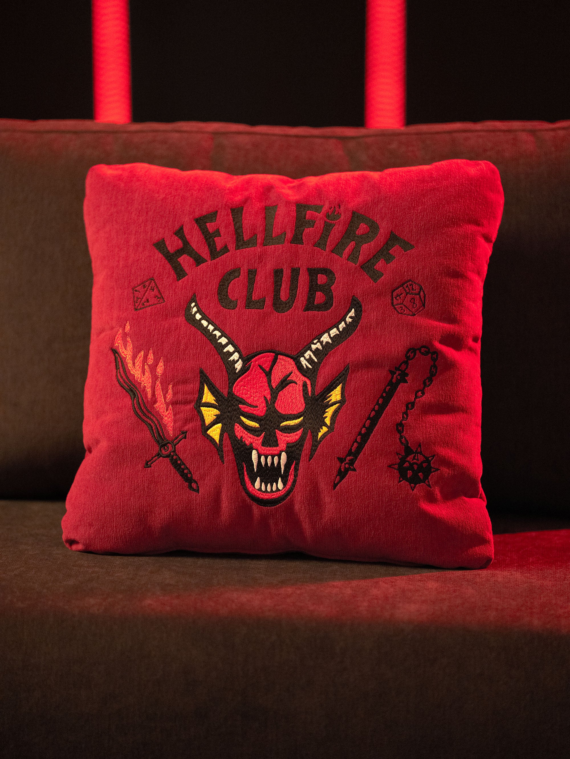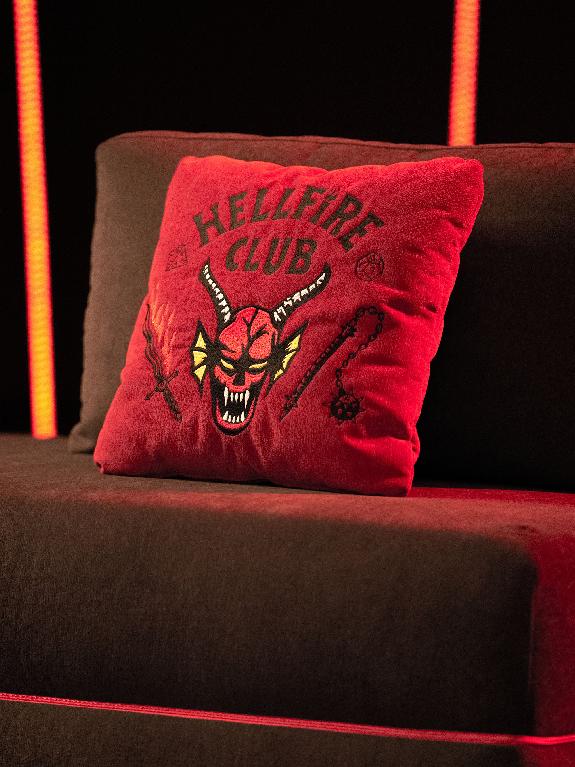 Directement issu de l'univers de Stranger Things et de la collaboration officielle entre Netflix et Divani.store, le coussin Hellfire Club – Édition limitée rend hommage au club le plus mythique de la série et aux fans qui en partagent l'esprit.