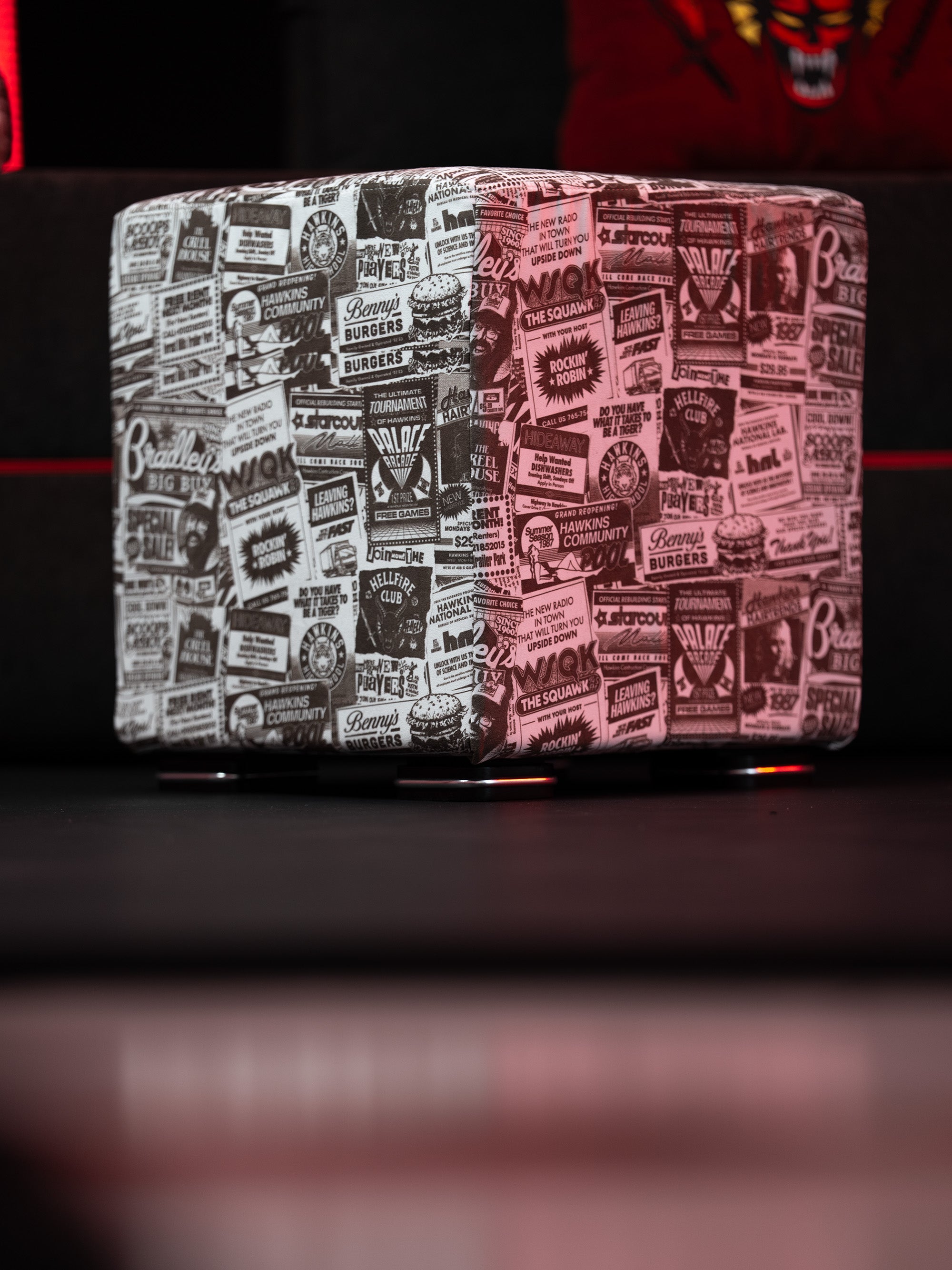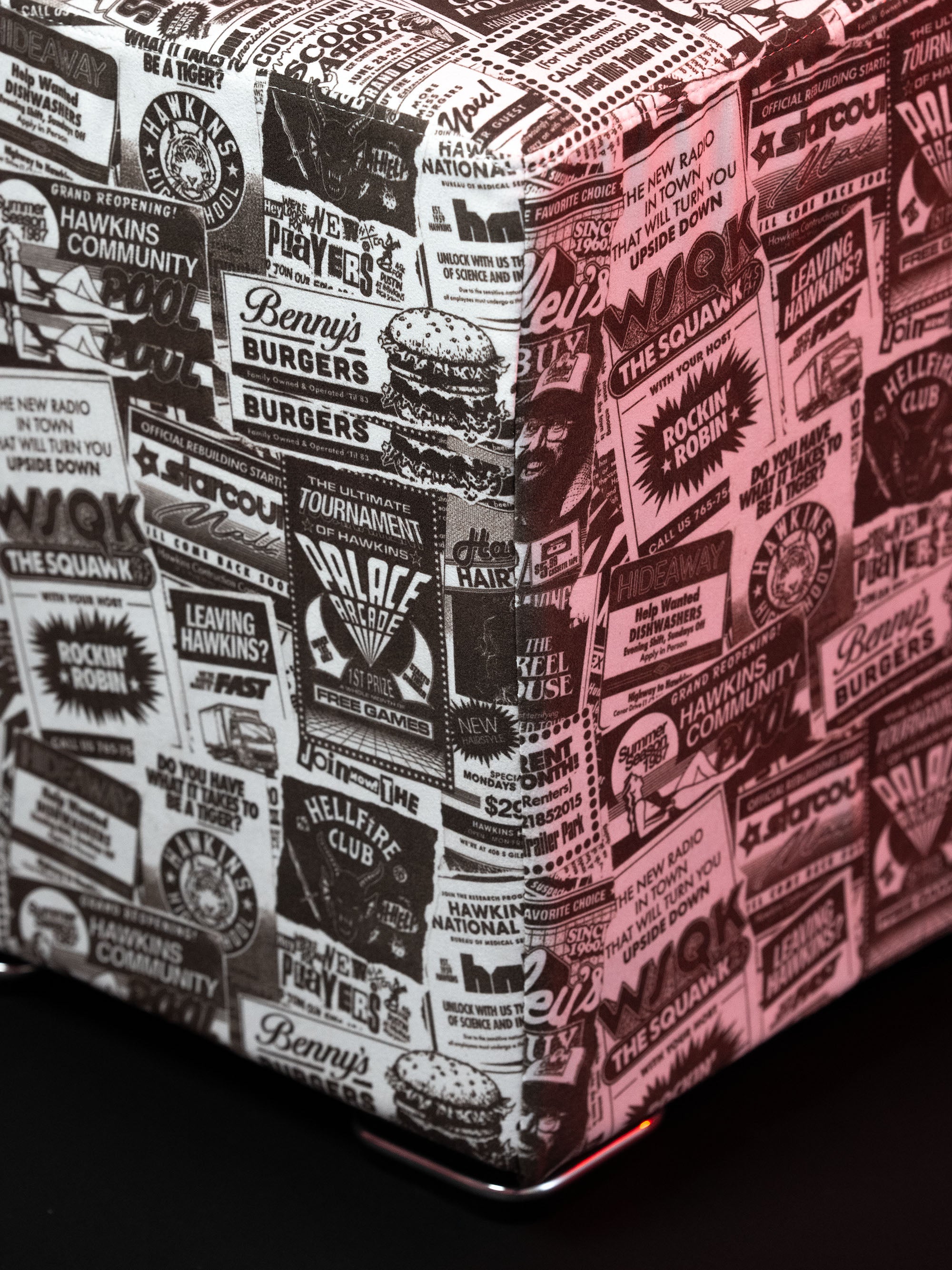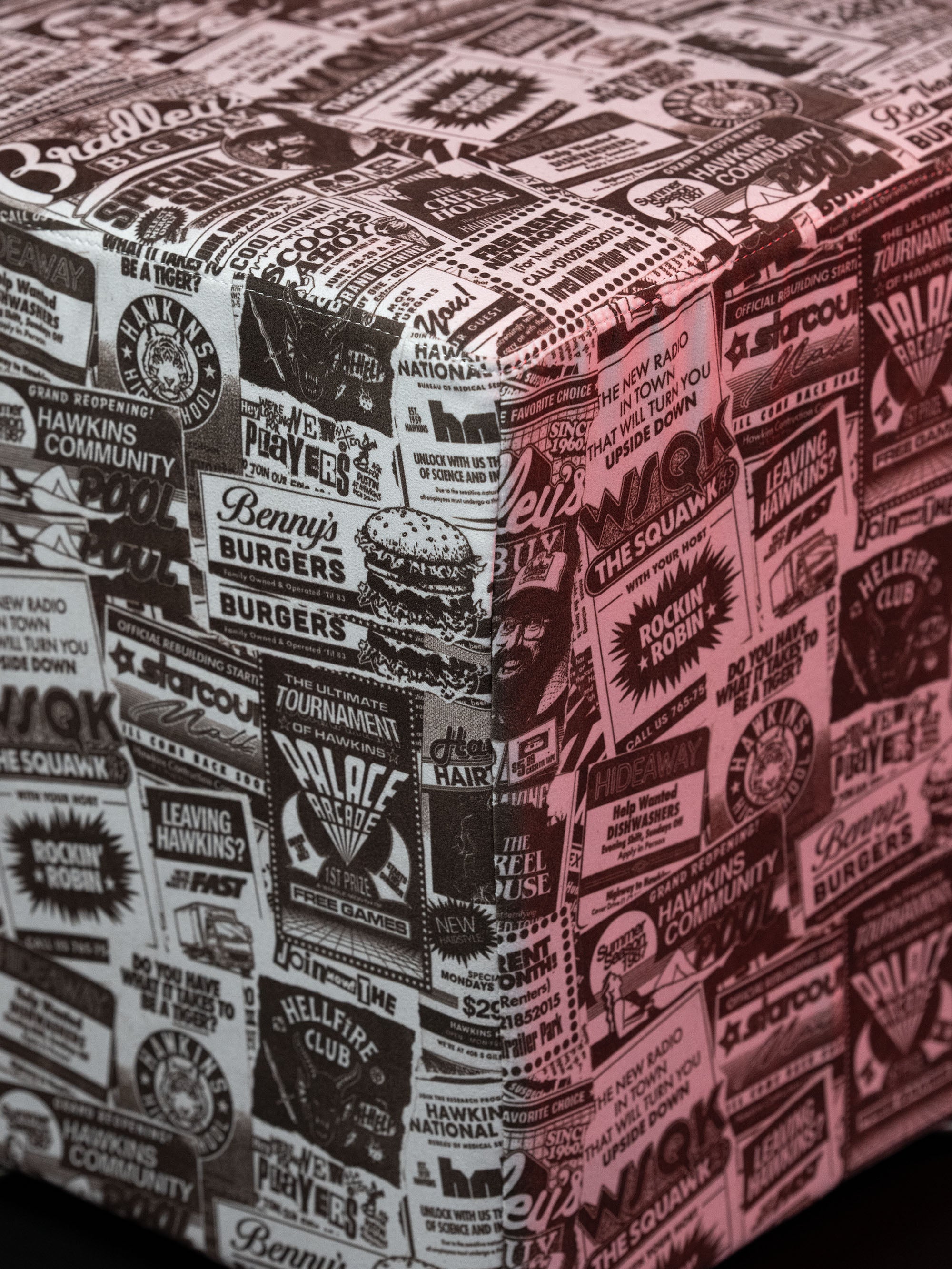 Le pouf Cube Hawkins Post est entièrement recouvert d'un tissu imprimé sur le thème « Hawkins Post », inspiré des graphismes vintage des journaux et des annonces de la série Stranger Things. Chaque côté raconte un fragment de ce monde mystérieux fait d'aventures, d'amitiés et de secrets, dans un équilibre parfait entre nostalgie et modernité.