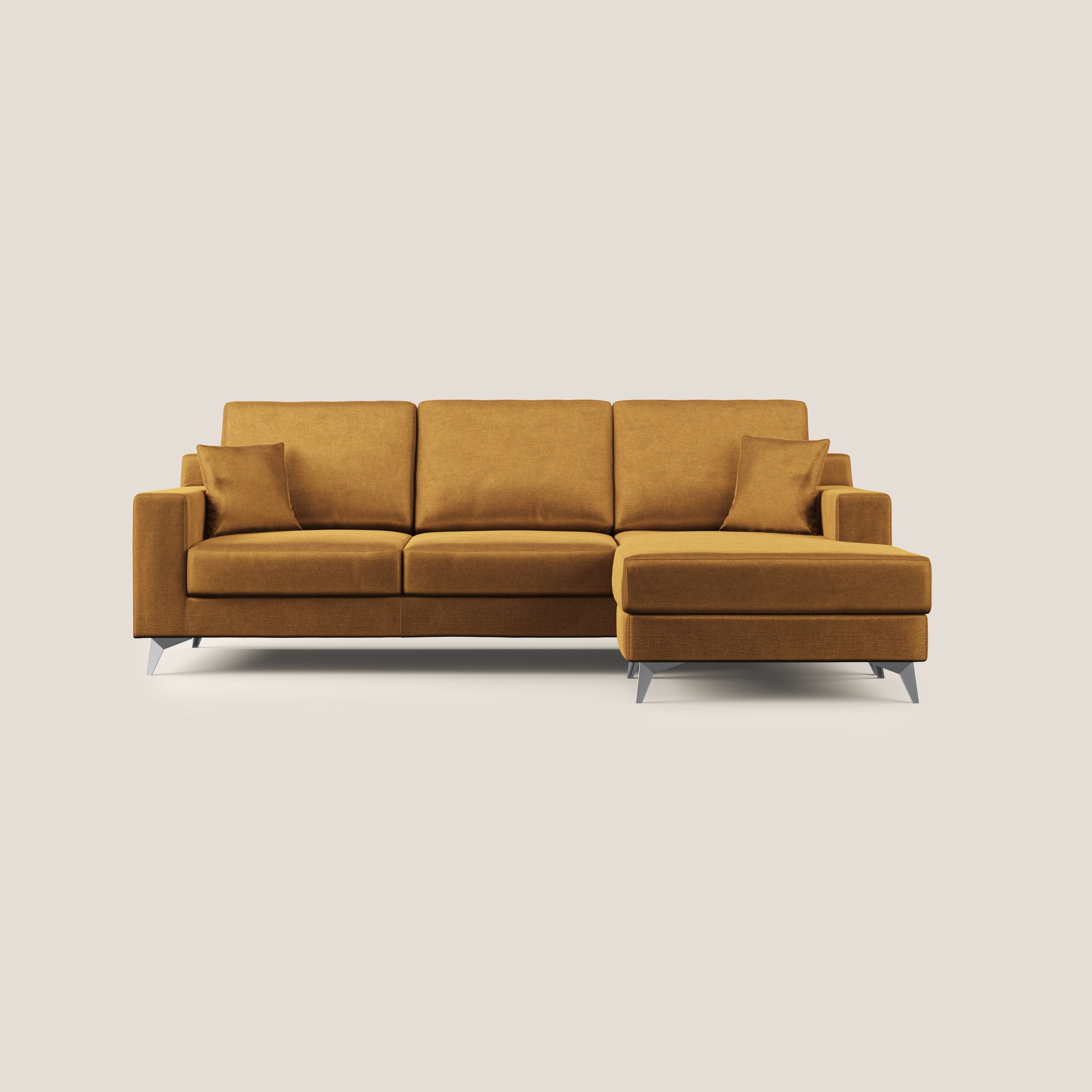 Sa production italienne, sa structure en bois aggloméré sont une garantie de solidité. Réalisé avec un très beau velours doux et imperméable, il permet d'éliminer la tache avant que celle-ci ne vienne absorbée. Les pieds hauts en métal enrichissent l’esthétique du canapé et lui donnent un sens de légèreté.