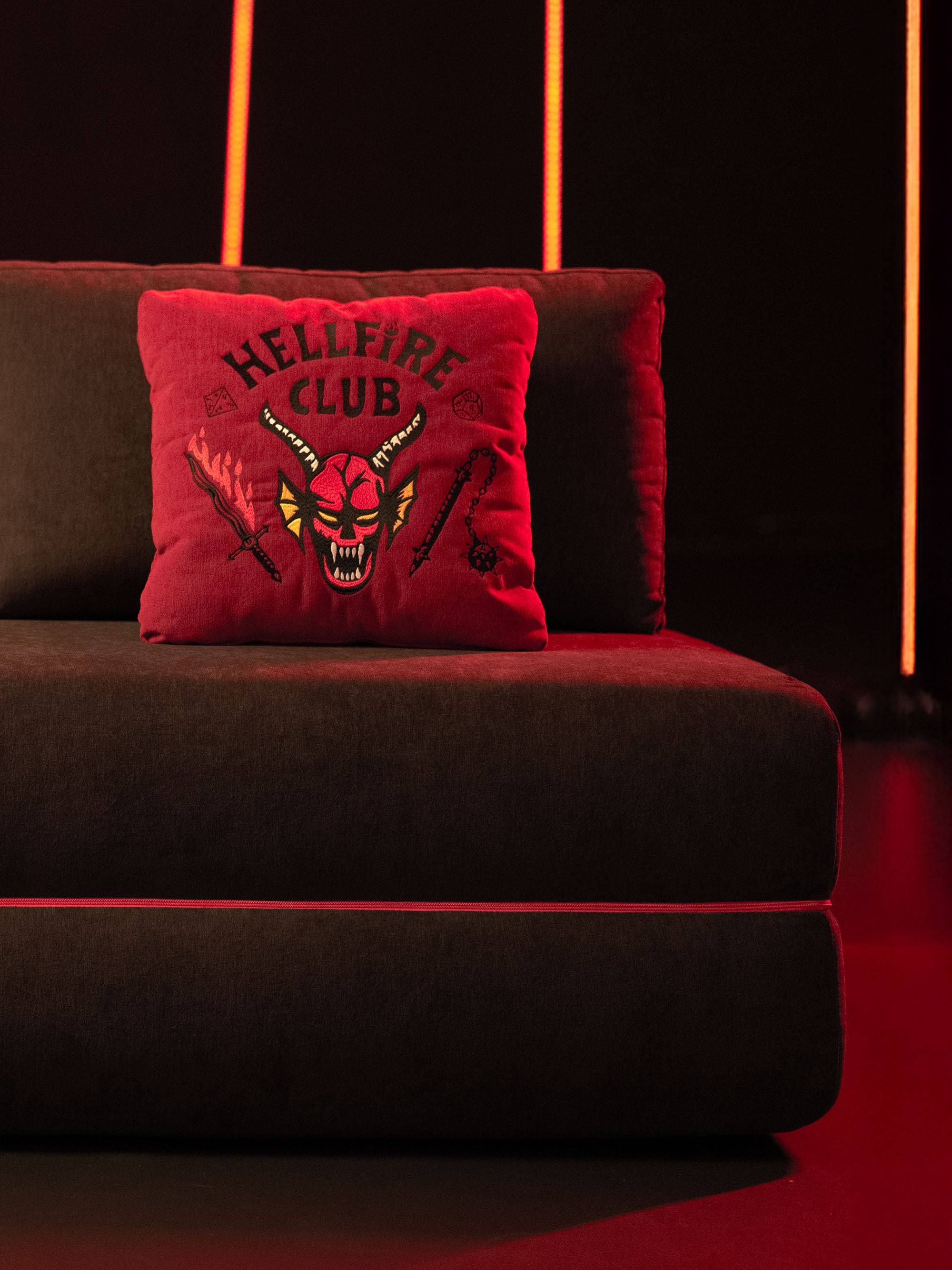 Comme chaque pièce de la collection Stranger Things Edition, le fauteuil-lit est soigné dans les moindres détails : le logo « Stranger Things » brodé sur le devant, l'écusson Hellfire Club sur le côté et l'intérieur matelassé avec un imprimé thématique évoquent l'atmosphère de la série, faisant de chaque transformation un petit voyage dans l'Envers.